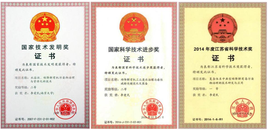 荣获国家科技进步奖二等奖1项,国家技术发明奖二等奖1项,获江苏省科学技术奖一等奖1项,中国优秀专利奖1项。同时获授权发明专利30项(其中美国授权专利2项);国家重点新产品1项;发表SCI论文30余篇;参与制订国家环境保护标准1项。技术与装备入选国家“十二五”科技创新成就展,接受了党和国家领导人、专家和公众的检阅,中央电视台、新华网、经济日报、中国环境报、中国科技网等多家媒体对展台进行宣传报道。