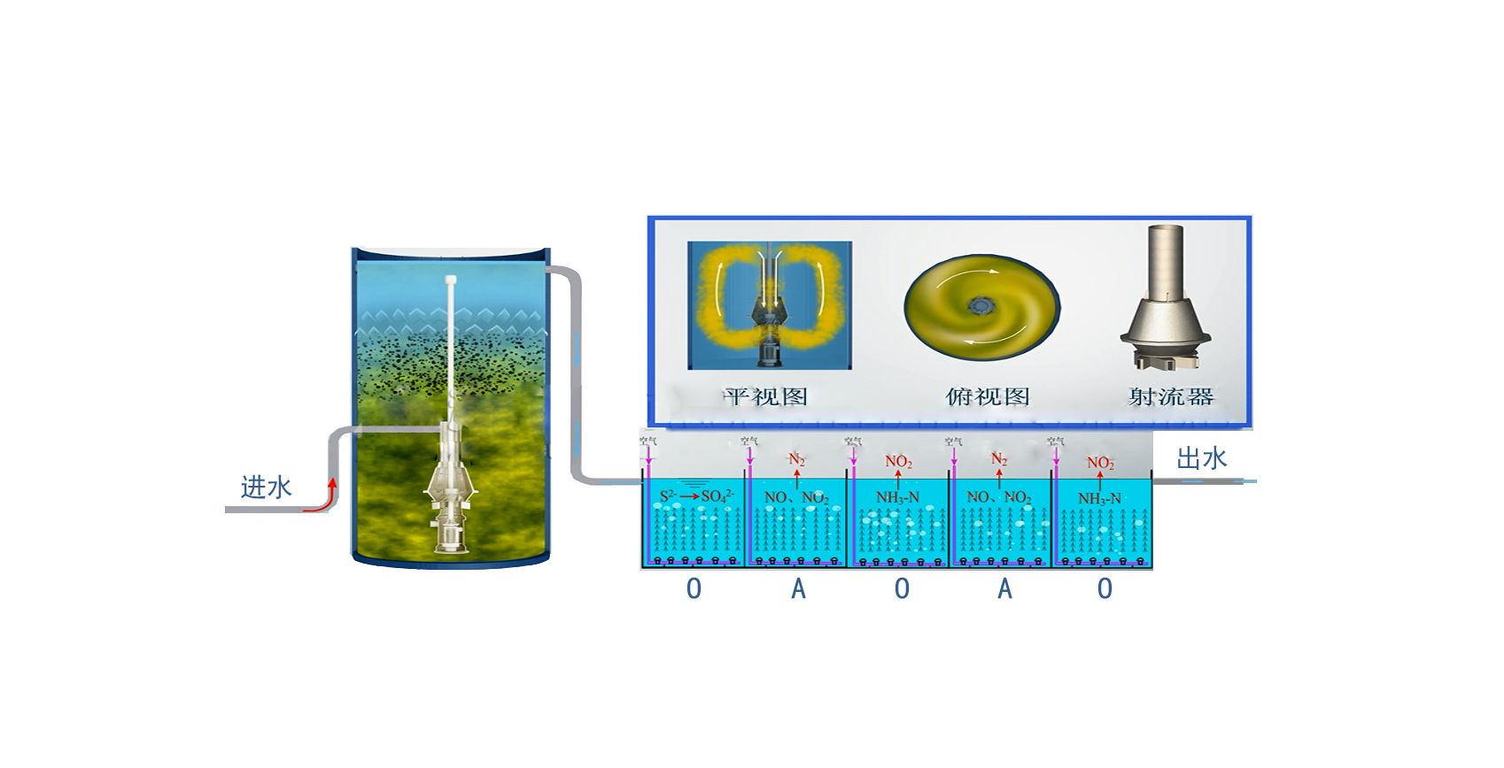 多级A/O技术通过有机氮氨氧化、短程硝化反硝化、反硝化、强化硝化菌群结构优化配置,实现TN、有机氮、氨氮、硝态氮及COD等污染物的同步高效去除。